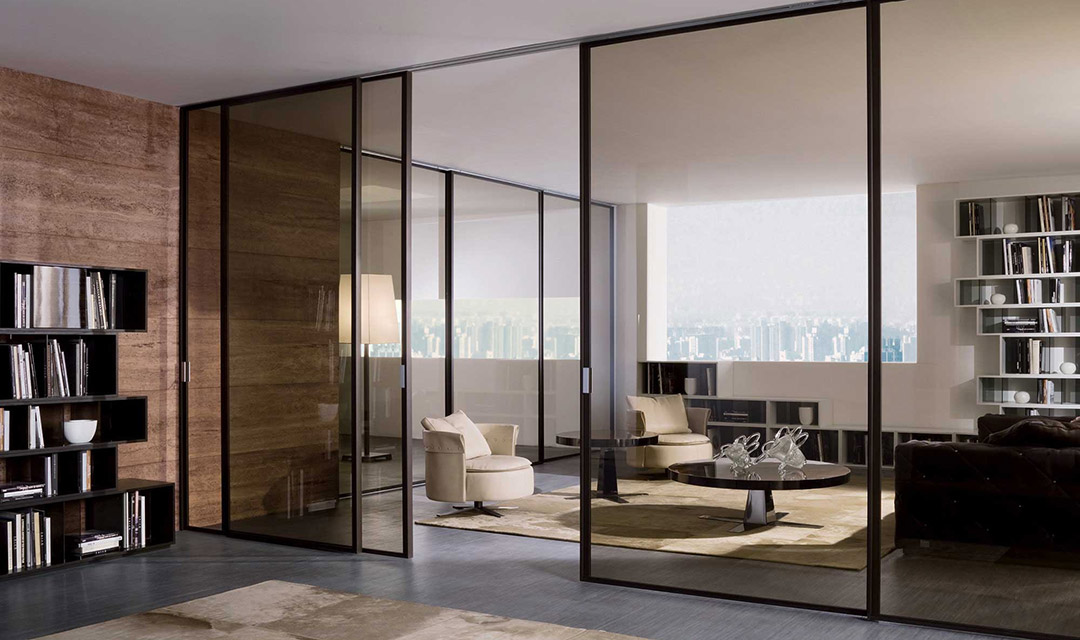 Отсутствие массивных коробок и наличников делает конструкцию визуально легкой. А возможность сделать перегородку от пола до потолка (без порогов и верхних балок) создает эффект монолитной стеклянной стены.